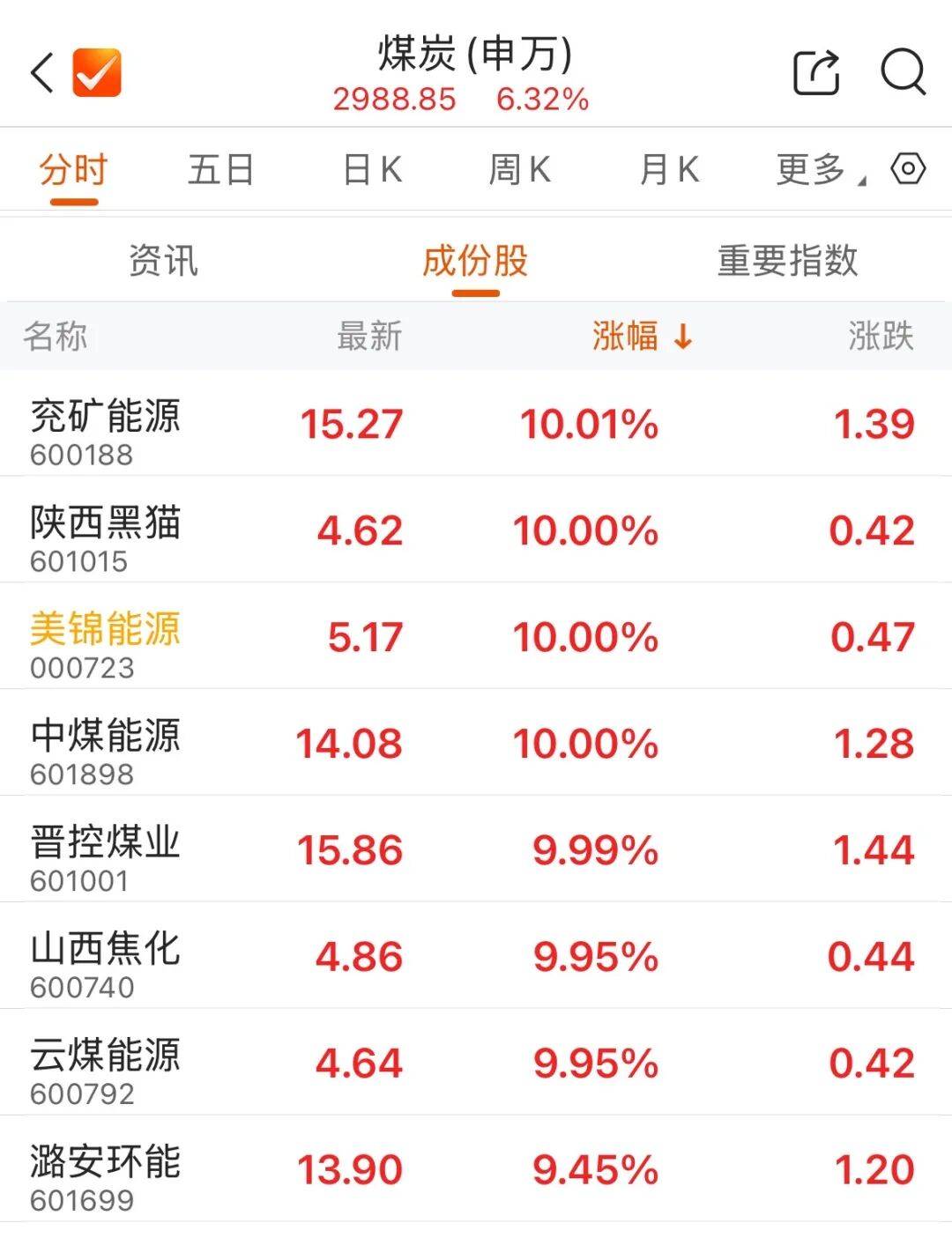 早盘,煤炭股爆发,板块内多股涨停。截至午间收盘,兖矿能源、中煤能源、陕西黑猫、美锦能源、晋控煤业、云煤能源等涨停。