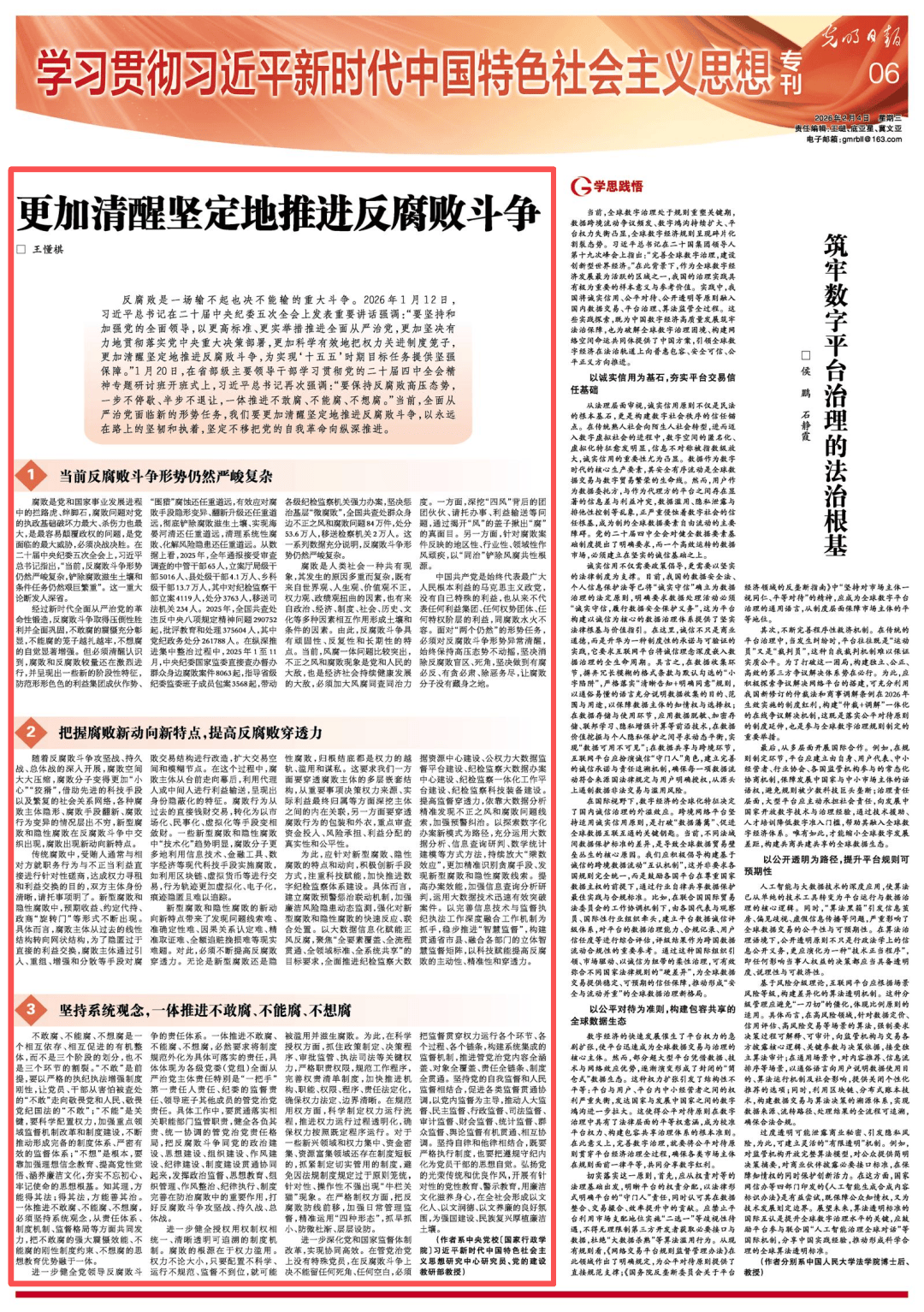 反腐败是一场输不起也决不能输的重大斗争。2026年1月12日,习在二十届中央纪委五次全会上发表重要讲话强调:“要坚持和加强党的全面领导,以更高标准、更实举措推进全面从严治党,更加坚决有力地贯彻落实党中央重大决策部署,更加科学有效地把权力关进制度笼子,更加清醒坚定地推进反腐败斗争,为实现‘十五五’时期目标任务提供坚强保障。”1月20日,在省部级主要领导干部学习贯彻党的二十届四中全会精神专题研讨班开班式上,习再次强调:“要保持反腐败高压态势,一步不停歇、半步不退让,一体推进不敢腐、不能腐、不想腐。”当前,全面从严治党面临新的形势任务,我们要更加清醒坚定地推进反腐败斗争,以永远在路上的坚韧和执着,坚定不移把党的自我革命向纵深推进。
